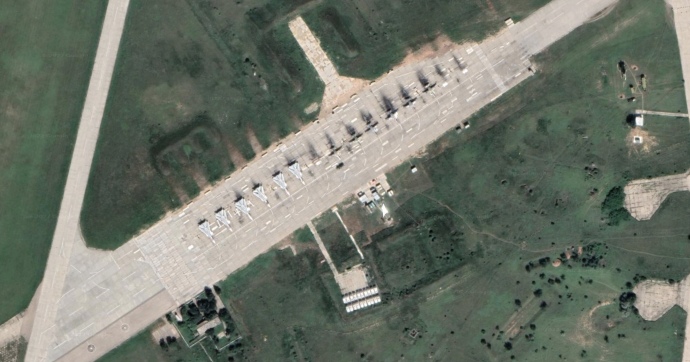 Аеродром у Гвардійському. Засновник Bellingcat, розслідувач Христо Грозєв написав, що на авіабазі було 12 літаків СУ-24М і 12 СУ-25СМ.