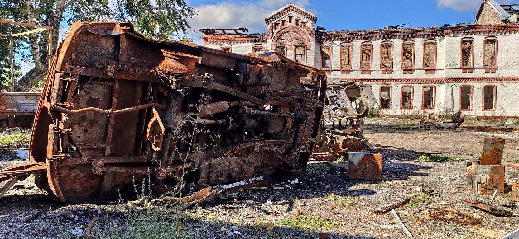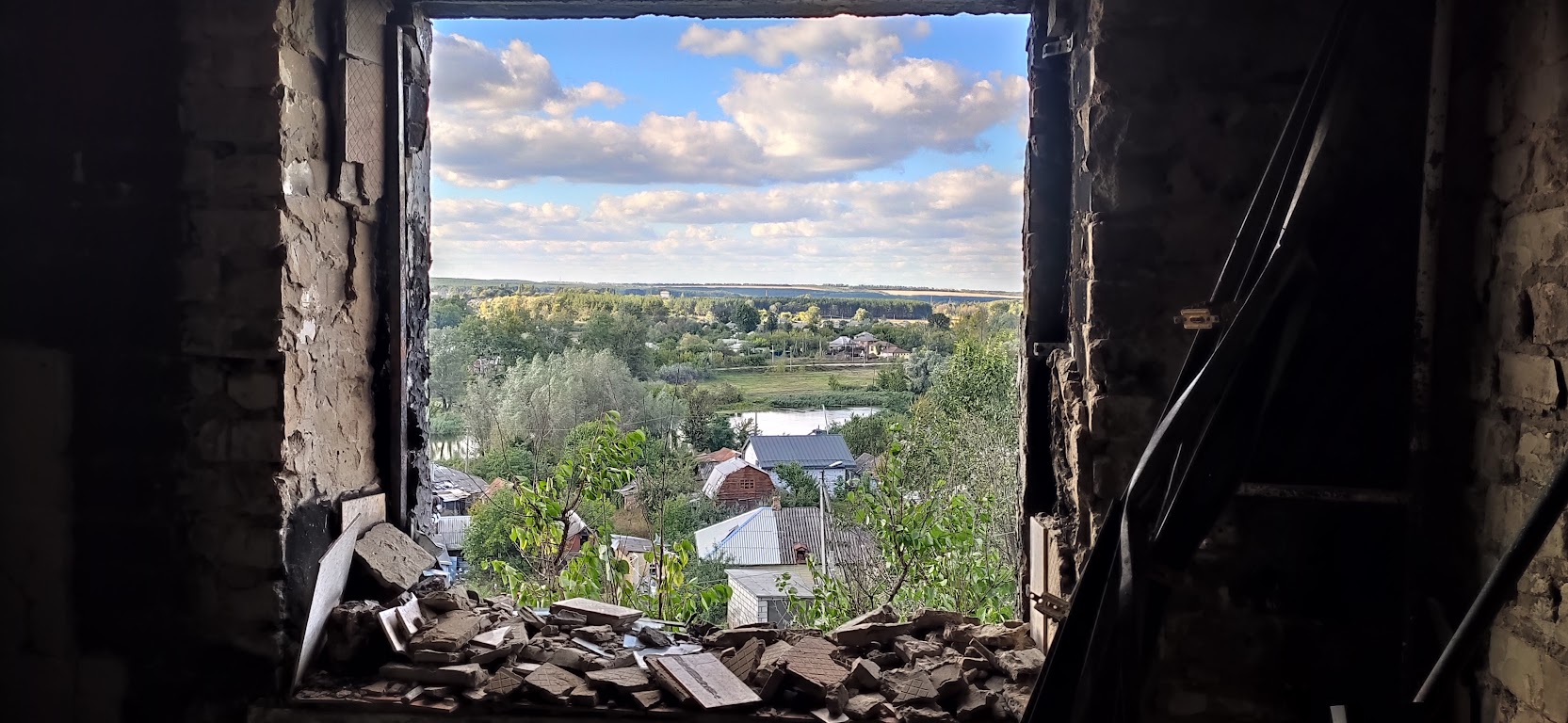 За парком зруйнована авіаударами старовинна будівля школи. Там у підвалі під час облоги ховалися від обстрілів місцеві. Разом із ними якийсь час жила і невелика група тероборонівців, які відійшли сюди після підриву мостів.