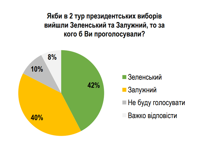 УП мала можливість ознайомитись із повними даними того дослідження, проведеного, але не опублікованого групою "Рейтинг". І головний графік стосується не того, що чинний президент виходить у другий тур із генералом Залужним, а того, що цей другий тур Зеленський може не виграти.