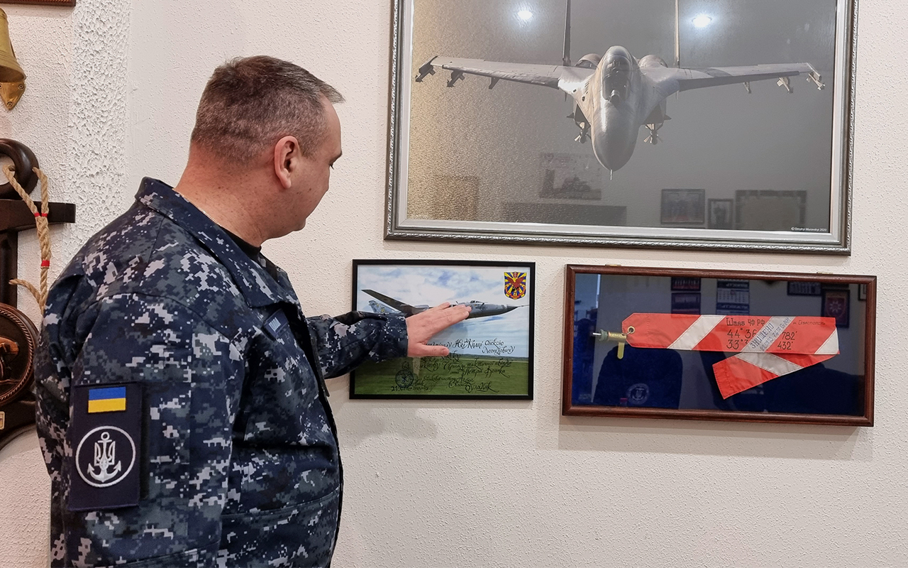 Трохи далі на стіні висять поруч фото українського винищувача та сигнальна стрічка від ракети Storm Shadow, яка перетворила на згарище Штаб чорноморського флоту в Криму.