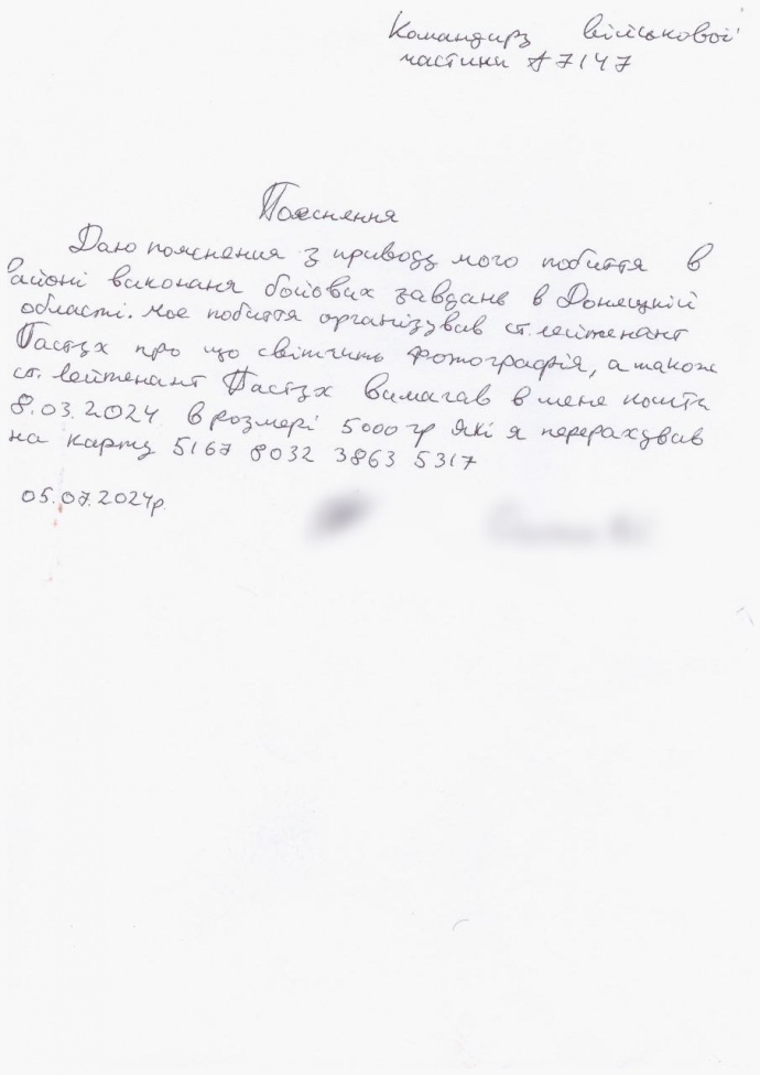 Дослівно з пояснення зі збереженням стилістики і пунктуації: "Я, …, передавав гроші солдату Удоду для передачі м-ру Сірому задля того, щоб мене не везли на освідчення. Гроші перекидалися на банківську картку та передавалися готівкою.