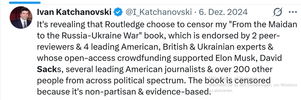 В связи с большим количеством твитов, ретвитов и просмотров книги Качановского мы, как научные исследователи Восточной Европы, принимаем здесь необычный шаг — совместно выступить с предупреждением в отношении книги Российско-украинская война и её истоки: работа Качановского представляет собой труд, содержащий фундаментальные недостатки в отношении своей темы — причин нападений России на Украину в 2014 и 2022 годах. Явная популярность книги на X и высокие показатели просмотров на сайте издательства, видимо, в значительной степени связаны с поддержкой со стороны Маска, Сакса и/или других промоутеров, а не с качеством изложенных в ней аргументов.