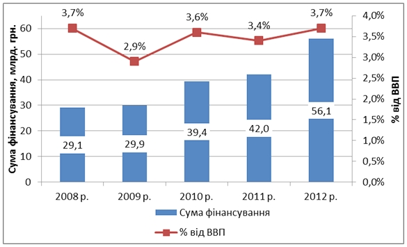Зрушення суттєві, якщо вимірювати їх у мільярдах гривень. Якщо ж у відсотковому відношенні до ВВП – картина майже стабільна. Як видно з діаграми – фінансування галузі наступного року на рівні 2008 – 3,7% від ВВП.
