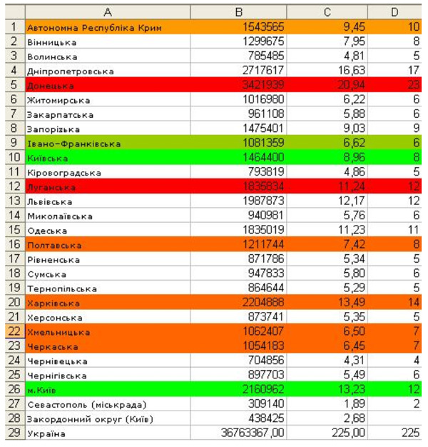 Столбец "С" показывает "справедливое" количество округов, согласно принципу пропорционального представительства. В столбце "D" – то количество, которое есть на данный момент, а точнее – количество одномандатных мажоритарных округов, отведенное областям ЦИКом накануне парламентских выборов 2002 года.
