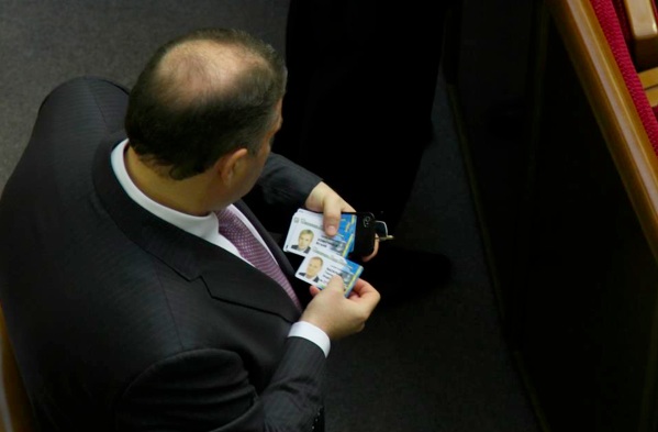 Також картки народних депутатів Віталія Хомутинніка та Геннадія Васильєва в руках іншого народного депутата і можливо були використані під час голосування з порушенням Конституції.