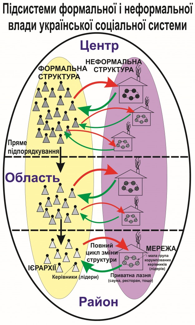 Реальна влада в Україні розподілена між суб'єктами управління – формальними і неформальними організаційними системами, кожна з яких займає фіксований рівень у їх ієрархії, таким чином, що ступінь свободи у прийнятті рішень кожного з суб'єктів нижчих рівнів обмежуються стратегією суб'єкта вищого рівня управління.