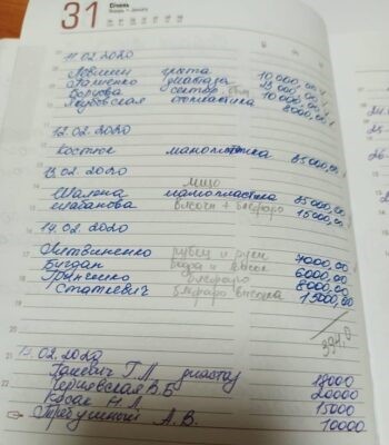 На одній із сторінок блокноту Вікторії Андрушкевич записані надходження "чорної бухгалтерії" за лютий 2020 року пластичного хірурга Дмитра Валерійовича Шагана.