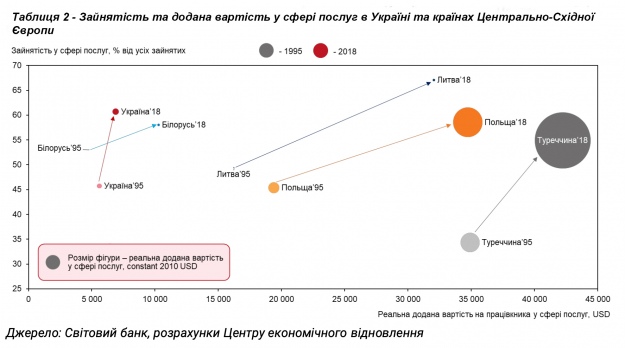 На графіках 1-4 видно, що у сфері послуг частка зайнятості зросла з 45% до понад 60%, а продуктивність одного працівника майже не змінилась, і зростання спостерігається лише на 1284 дол. США. Для порівняння, у Польщі — на 15 339 дол., у Литві — на 15 823 дол.