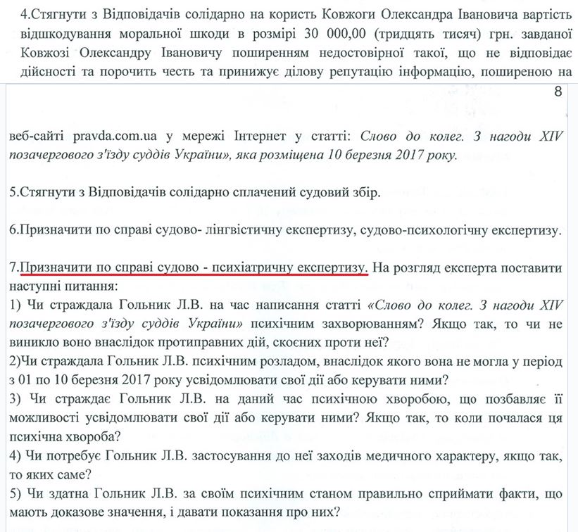 Він вимагав від мене та УП 30 тисяч гривень матеріальної сатисфакції. І водночас призначення відповідачу психіатричної експертизи!