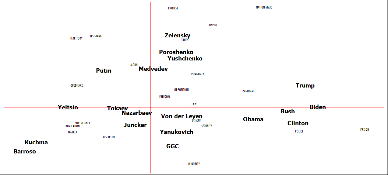 Вище, нiж у генерал-губернаторiв Канади, чиї промови готують демократично обранi прем’єр-мiнicтри. На графiку їх промови мають позначку GGC; чим ближче той чи iнший президент до ключих слiв, обраних за допомогою творiв саме Фуко, тем бiльш його чи її характеризують цi слова.