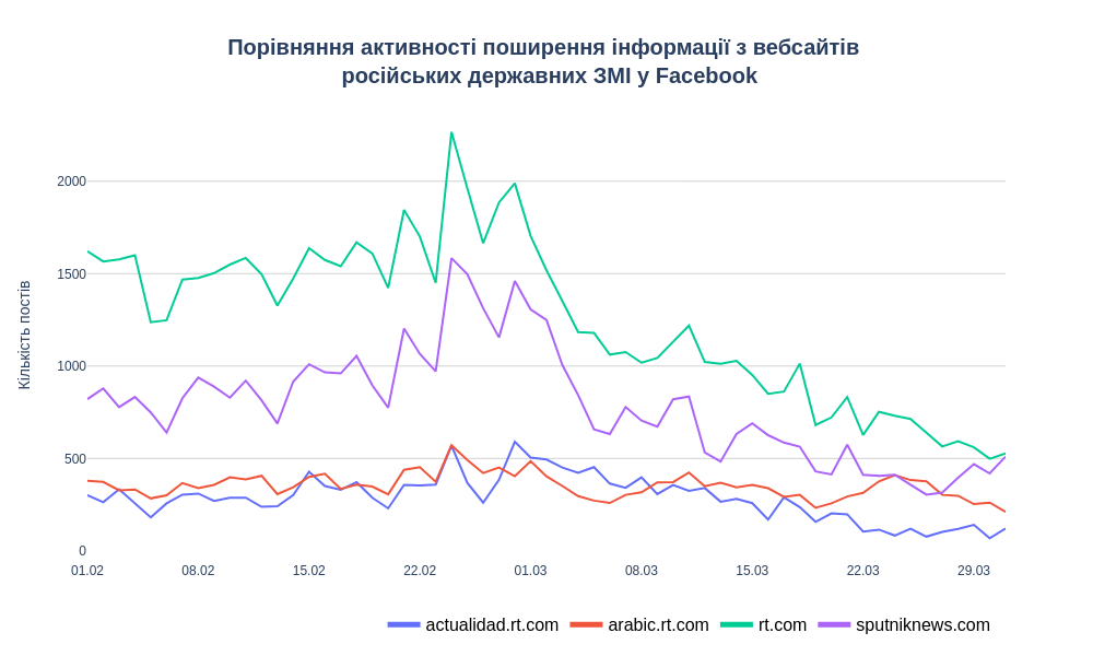 Зокрема, 31 березня у Facebook ми зафіксували щонайменше 2040 публікацій із пропагандистських ресурсів. Звісно, хоча цей показник учетверо менший за максимальні 8027 дописів 24 лютого, він все ще достатньо великий для того, аби й надалі впливати на громадську думку за кордоном.