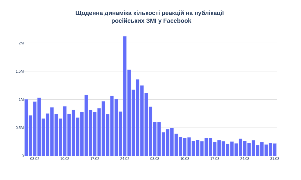 Загалом з 1 лютого до 31 березня у Facebook опублікували 236 413 посилань на сайти російських державних ЗМІ. Однак тут варто зазначити, що Crowdtangle не збирає публікації з особистих неверифікованих сторінок, а також із груп та сторінок з невеликою кількістю підписників. Тож реальне охоплення російських державних ЗМІ значно більше за наведені цифри. Втім, їх кількість була нерівномірною: у лютому таких посилань опублікували майже 154 тисячі, а у березні – вдвічі менше (82 тисячі).
