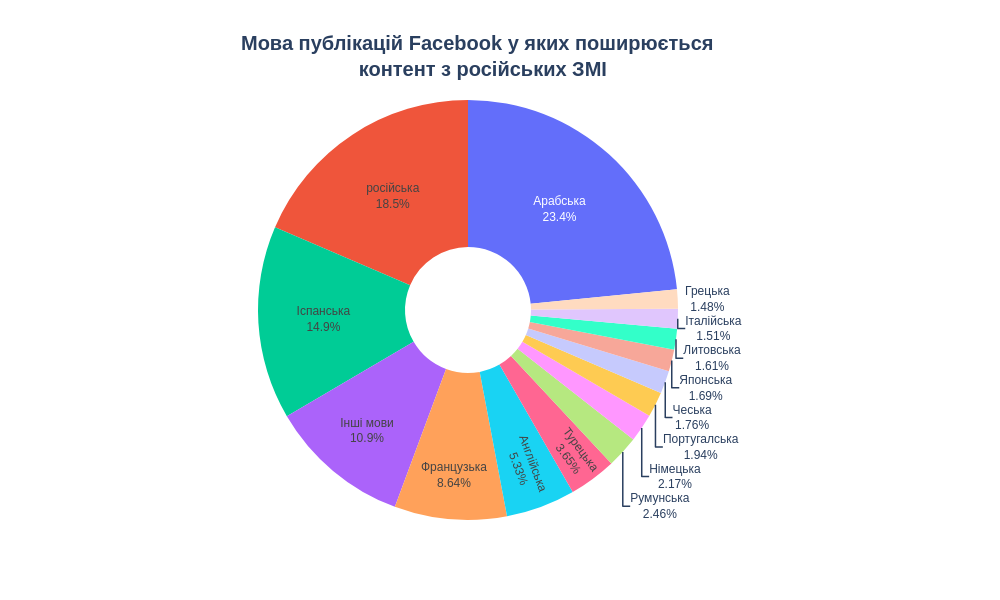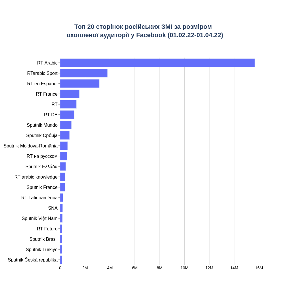 Серед Facebook-сторінок понад 50% взаємодій із дописами (лайки, коментарі, репости) припадають на групу арабських сторінок Russia Today (RT Arabic, RTarabic Sport, RT arabic knowledge, тощо). Так, лише дві сторінки, Rt Arabic та RTarabic Sport, за лютий-березень охопили майже 20 млн користувачів у Facebook, опублікувавши понад 30 тисяч повідомлень. Попри обмеження, досить великі охоплення аудиторії для пропагандистів також дають іспанська, французька, англійська та німецька сторінки Russia Today.