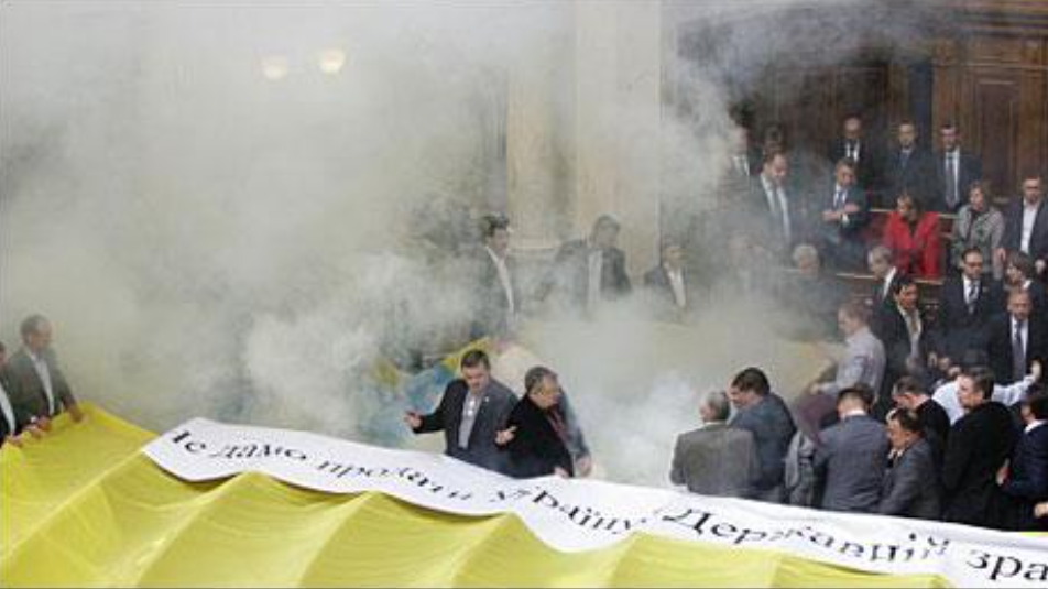 Коли в парламенті проводили антиконституційне голосування, в результаті якого росія отримала плацдарм для тимчасової анексії Криму, спікер Володимир Литвин сидів під парасольками, бо опозиція закидала його яйцями. Крісла опозиції були накриті синьо-жовтим прапором. На плакатах були написи: "Державна зрада".