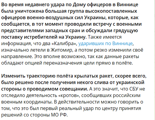 А 18 липня з'явилася нова версія: "відставки в СБУ та ГПУ – це помста Зеленського за "калібровку" (так пропагандисти називають удар "Калібром" – ред.) Будинку офіцерів у Вінниці, що стало першим ударом по центру прийняття рішень".