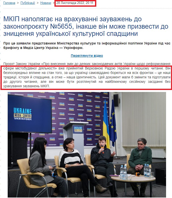 Але у день голосування Комітету Мінкульт уже виступив із заявою, що парламентарі мають врахувати зауваження, інакше новий закон може загрожувати збереженню історичної культурної спадщини держави.