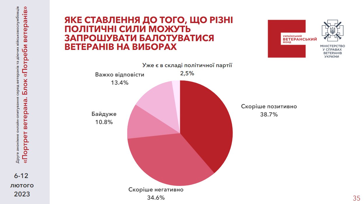 В опитуванні від УВФ, проведеному в лютому 2023 року, 34% чинних та майбутніх ветеранів негативно ставляться до того, що їхніх побратимів та посестер можуть залучати до політики. Дані виглядають таким чином: