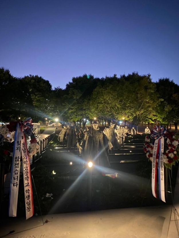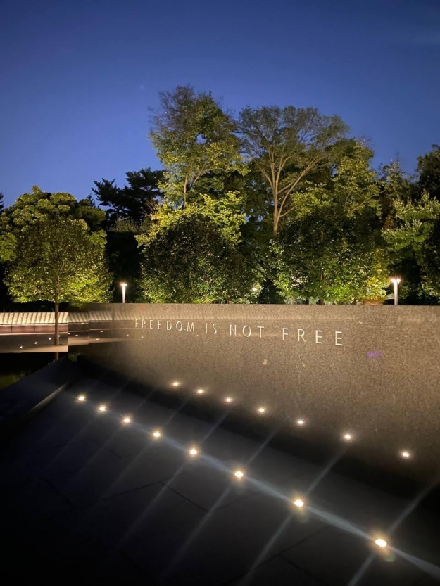На останок, хотіла б розповісти про враження від Меморіалу ветеранів Корейської війни (1950-1953 років), що у Вашингтоні. Центральна композиція – це 19 фігур американських солдатів, зроблених із нержавіючої сталі, що ніби повільно просуваються серед зелених зарослів Корейських гір. Ці 19 фігур відбиваються на гранітній стіні і таким чином кількість вояків візуально подвоюється, особливо це мурашить вночі, коли скульптури підсвічуються.