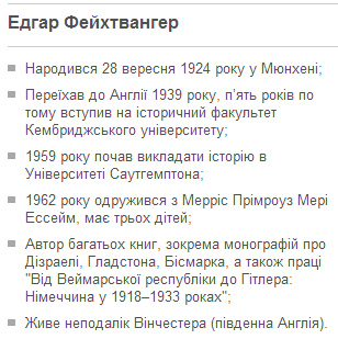 "Звісно, я знав, хто це був, хоч я і був малий, – каже Фейхтвангер, дещо повільно, але чисто вимовляючи англійські слова. – Він був рейхсканцлером, головною дійовою особою на сцені".