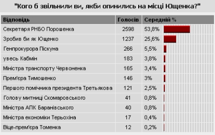 Согласно результатам опроса, по состоянию на 11 часов вторника за увольнение именно Порошенко проголосовали 53,8% опрошенных, а именно 2598 посетителей украинской версии и 23,3% (244) русской версии Украинской правды.