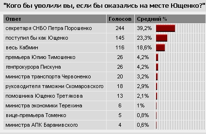 Министра АПК Александра Баранивского уволили бы 40 читателей, министра экономики Сергея Терехина - 17 человек. На последнем месте в украинской версии оказался бывший вице-премьер по гуманитарным вопросам Николай Томенко. На месте Ющенко его бы уволили лишь 12 человек, что составляет 0,2% опрошенных.