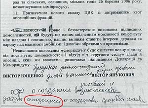В варианте первоначальных требований, выдвинутых президенту Виктору Ющенко лидером Партии регионов Виктором Януковичем, слово "оппозиция" написано с двумя ошибками.