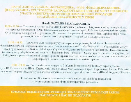 В программе значится "выступление первой леди "оранжевой революции" Юлии Тимошенко, полевого командира Губского, революционных деятелей Терехина, Зварича, Турчинова, Зинченко, Мельниченко".
