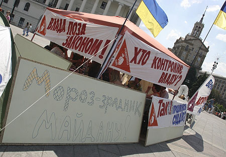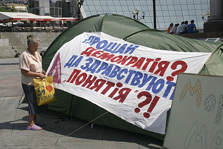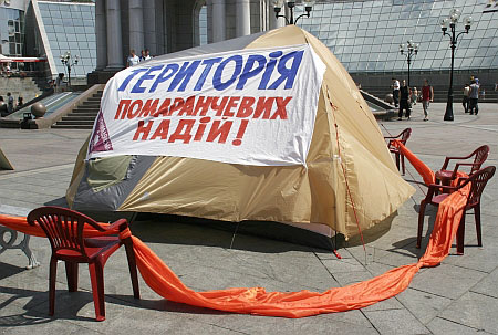 На палатках размещены лозунги "Мороз – предатель Майдана", "Территория оранжевых надежд", "Прощай демократия, да здравствуют понятия?!"