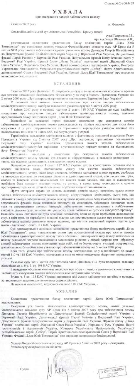 На сайте БЮТ также приводится копия постановления Феодосийского городского суда с мокрой печатью относительно отмены своего решения.