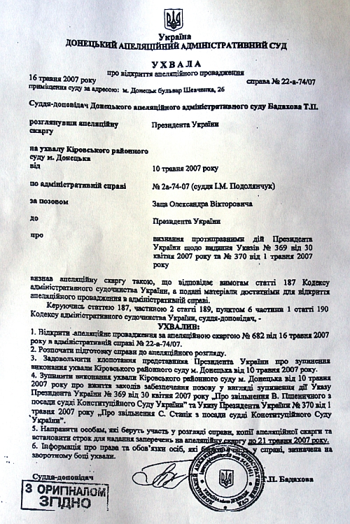 Донецкий апелляционный административный суд остановил выполнение судебного постановления Кировского райсуда об указах президента об увольнении судей Конституционного Суда Сюзанны Станик и Валерия Пшеничного.