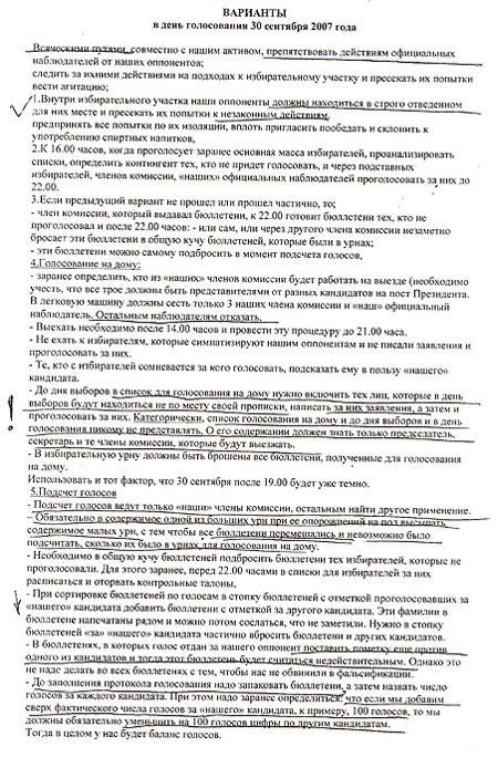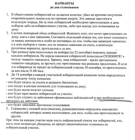 Как сообщает пресс-служба штаба, в инструкции четко, по пунктам, расписано, как должны действовать члены избирательных комиссий и официальные наблюдатели для того, чтобы сфальсифицировать результаты голосования и максимально усложнить процесс контроля выборов.
