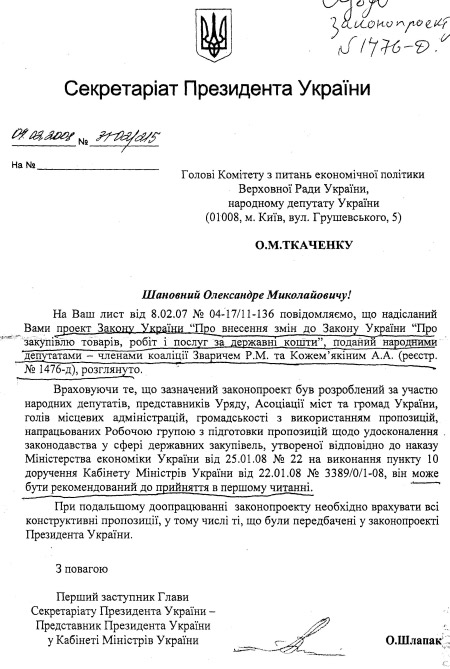 "В-третьих, именно эти изменения в закон были окончательно и полностью согласованы с секретариатом президента Украины и завизированы первым заместителем главы секретариата Александром Шлапаком. Весь процесс был организован публично и прозрачно. Здесь нет никаких подводных течений или двойного дна", - заявляет он.