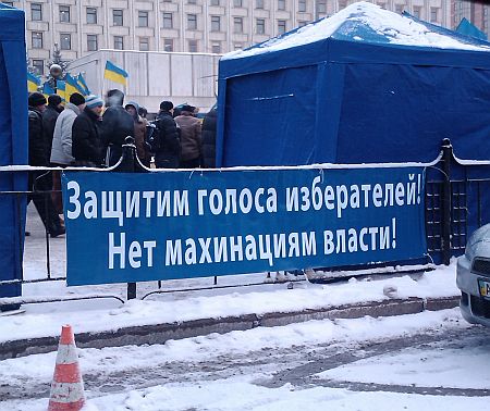 На площади установлена сцена. Митинг проходит под лозунгами "Украина - честные выборы", "Защитим выбор народа Украины" и "Защитим ЦИК" и с государственными флагами.