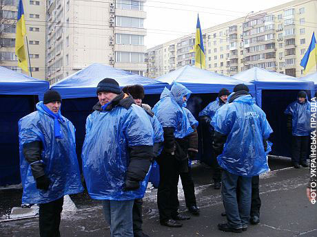 Всюду по периметру площади стоят синие палатки. На огромном экране перед ЦИК меняются надписи "Украина для людей", "защитим выбор народа Украины и т.п..