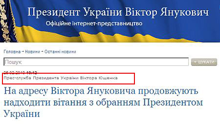 В так называемой "шапке" сайта теперь написано "Президент Украины Виктор Янукович", однако первое же сообщение о новом президенте до сих пор подписано "пресс-служба президента Виктора Ющенко".