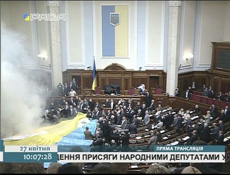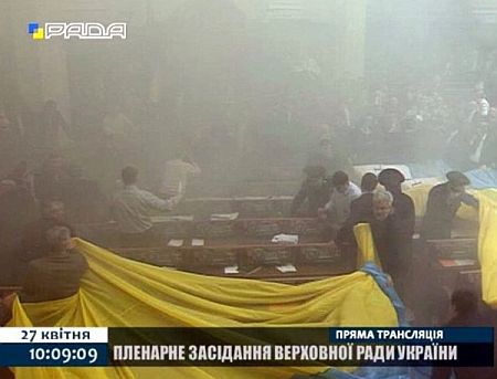 Дымовую шашку якобы бросили БЮТовцы. В свою очередь БЮТовцы утверждают, что дымовая шашка была брошена им под ноги кем-то из регионалов. Однако никто не может сказать, кто именно ее бросил.