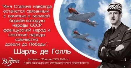 На плакате с Шарлем Де Голлем написана цитата французского лидера о роли Сталина в победе над фашизмом.