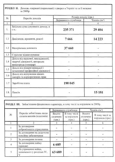В частности, Янукович получил 190 тысяч гривен зарплаты, 37 тысяч гривен материальной помощи и 7 тысяч гривен дивидендов, процентов и роялти.