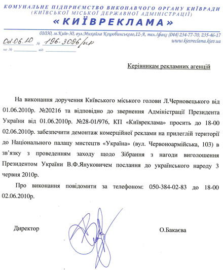 Об этом говорится в документе за подписью директора КП "Киевреклама" Бакаевой, переданном "Украинской правде" Ассоциацией внешней рекламы.