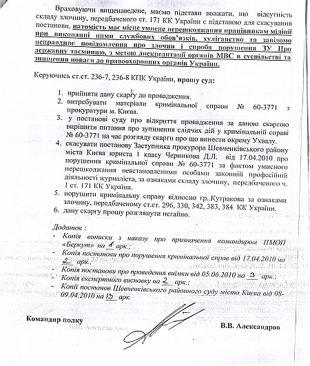 Об этом говорится в жалобе Александрова в Шевченковский райсуд города Киева на возбуждение прокуратурой уголовного дела по факту умышленного препятствования профессиональной деятельности журналиста Кутракова, которая есть распоряжении "Украинской правды".