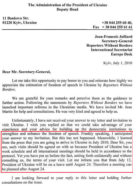 В следующем письме от 5 июля, которое Герман прислала генсекретарю "Репортеров без границ" в ответ сказано: