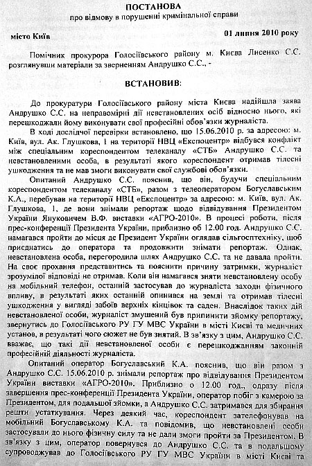 Прокуратура Голосеевского района Киева отказала журналисту СТБ Сергею Андрушко в открытии дела по препятствованию его профессиональной деятельности, не опросив охранников президента.