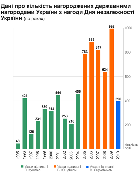 В частности, согласно статистике президентской канцелярии, больше всего указов о награждении ко Дню Независимости подписал Виктор Ющенко в 2009 году - 992. Меньше всего - Леонид Кучма в 1995 - 48.