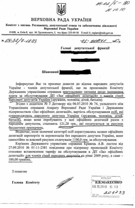 При этом Макеенко ссылается на соответствующее письмо за подписью руководителя Госуправления делами Андрея Кравца, в котором сообщается о "поддержке предложения Комитета относительно установления тарифа на обслуживание в Государственном предприятии "Зал официальных делегаций" для членов семей народных депутатов на уровне 2009 года, а именно - 180 гривен".