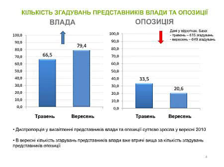 Как показал мониторинг освещения власти и оппозиции, осуществленный по заказу партии "Фронт перемен" компанией PRP Ukraine, частота упоминаний оппозиции упала с 33,5% в мае до 20,6% в сентябре.