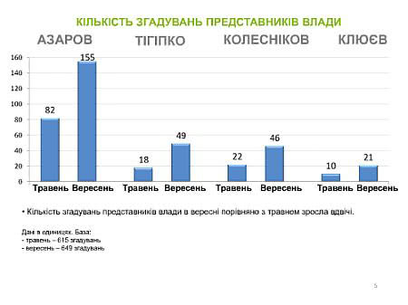 Козаченко добавил, что в мае среди упоминаний о деятельности президента в ведущих СМИ - 17,1% негативных сообщений, в сентябре - уже 10,7%. То же самое касается и премьер-министра - доля критики в его адрес снизилась с 19,5% в общем количестве сообщений до 11%.
