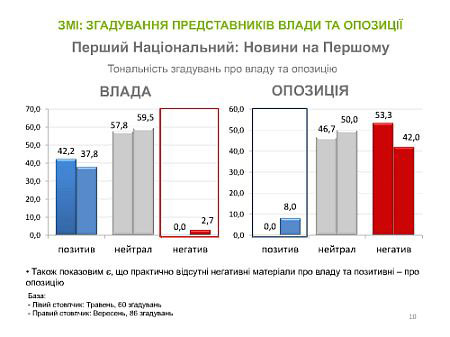 "На Первом национальном телеканале об оппозиции говорят в 14% общественно-политических материалов, о власти - вшестеро больше. При этом в 100% случаев власть упоминается в позитивном контексте. Оппозиция только в 16% - в положительном, в 84% - в негативном", - отметила пресс-служба.