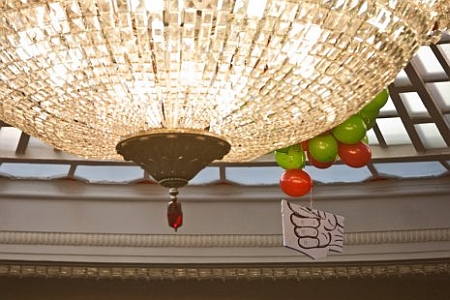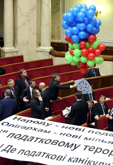 "Шиш" с воздушными шариками принесли депутаты от оппозиции Одарченко, Волынец и Сас в знак протеста против принимаемого Радой бюджетного кодекса.