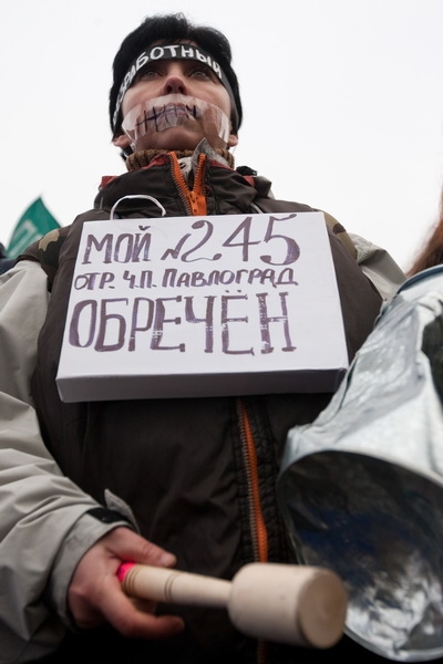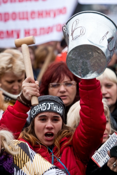 Кроме флагов, они держат плакаты с надписями: "Нет - Налоговому кодексу!", "Не дадим забрать наши деньги!", "У нас забрали все - оставьте роботу!".