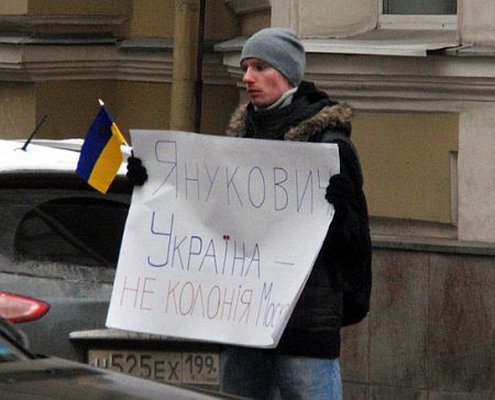 Активист стоял с плакатами "Янукович, Украина - не колония Москвы","Предприниматели, вместе победим".
